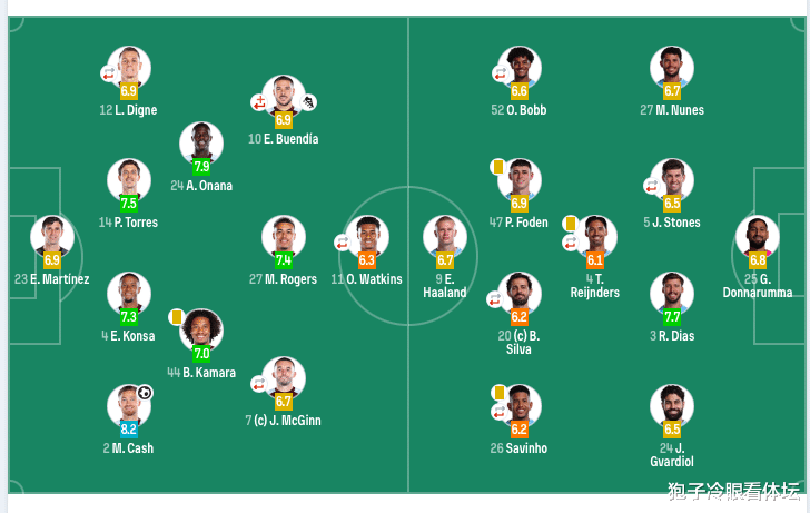 阿斯顿维拉首发:23-马丁内斯、2-卡什、4-孔萨、14-保·托雷斯、12-迪涅(86’22-马特森)、24-阿马杜·奥纳纳、44-布巴卡尔·卡马拉、7-麦金(74’29-盖桑)、10-布恩迪亚(29’19-桑乔)(74’6-巴克利)、27-罗杰斯、11-沃特金斯(86’17-马伦)。
